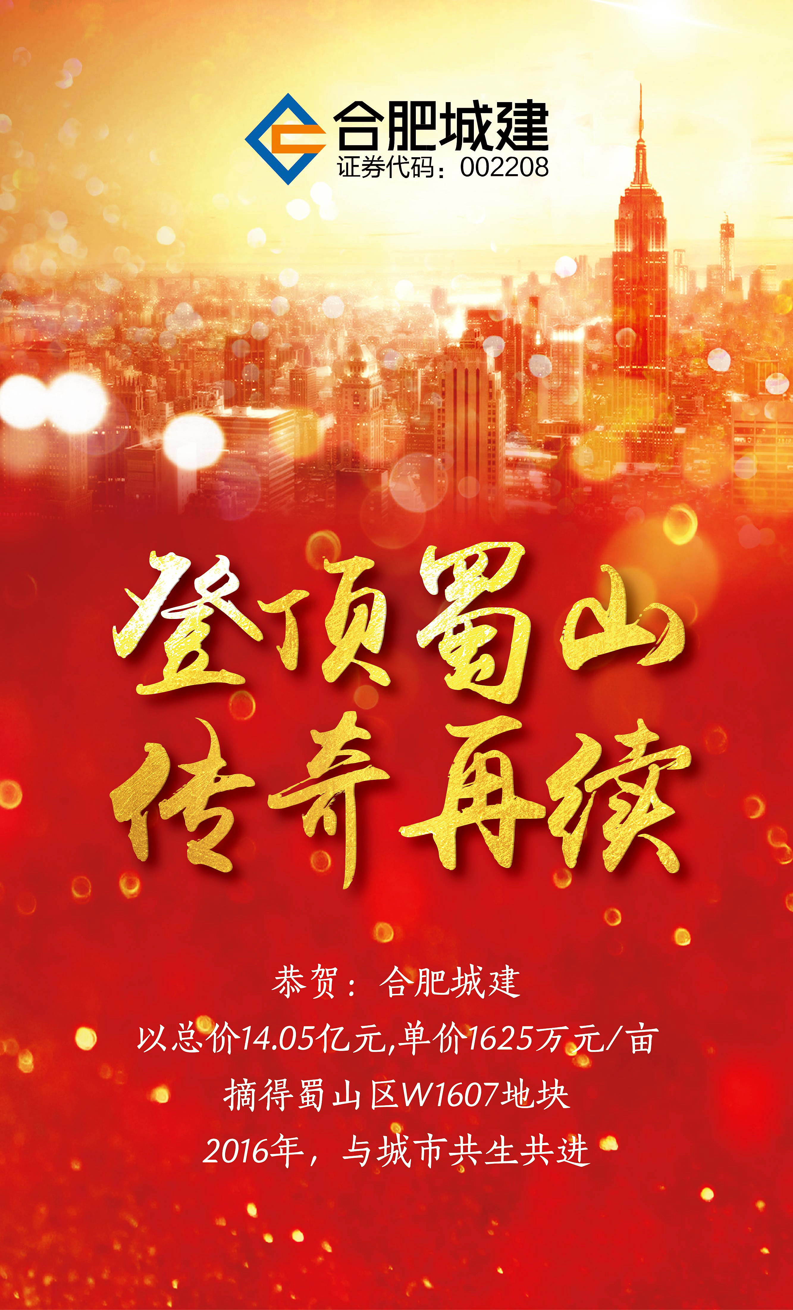 捷報(bào):合肥城建登頂蜀山 傳奇再續(xù) 2016年11月30日下午,合肥市區(qū)地塊首次全面“限價(jià)”土拍,超90家房企群雄逐鹿,合肥城建再度發(fā)力,最終以成交單價(jià)1625萬元/畝,總價(jià)14.05億元,成功競(jìng)得蜀山區(qū)W1607地塊。是合肥城建布局未來版圖的又一重大舉措。 該地塊占地面積86.44畝,東邊緊鄰西二環(huán),北邊緊鄰樊洼路,西...